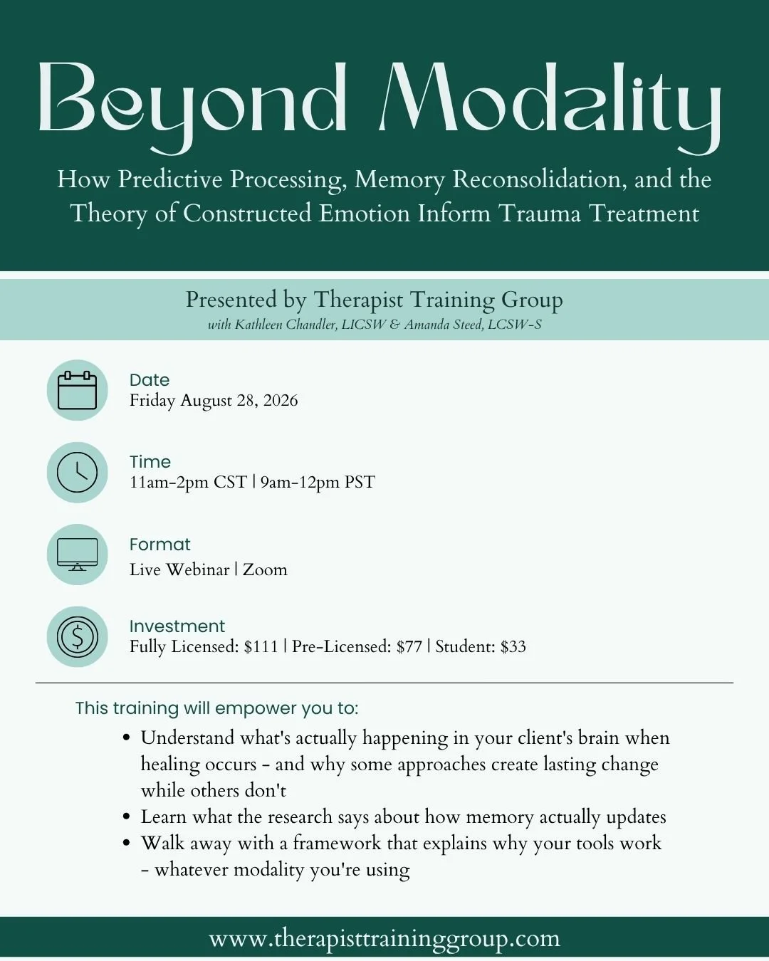 Here’s the thing—we believe all therapists, no matter their background, should have access to the best training that brings together liberatory frameworks and evidence-based modalities to get to the root of trauma.